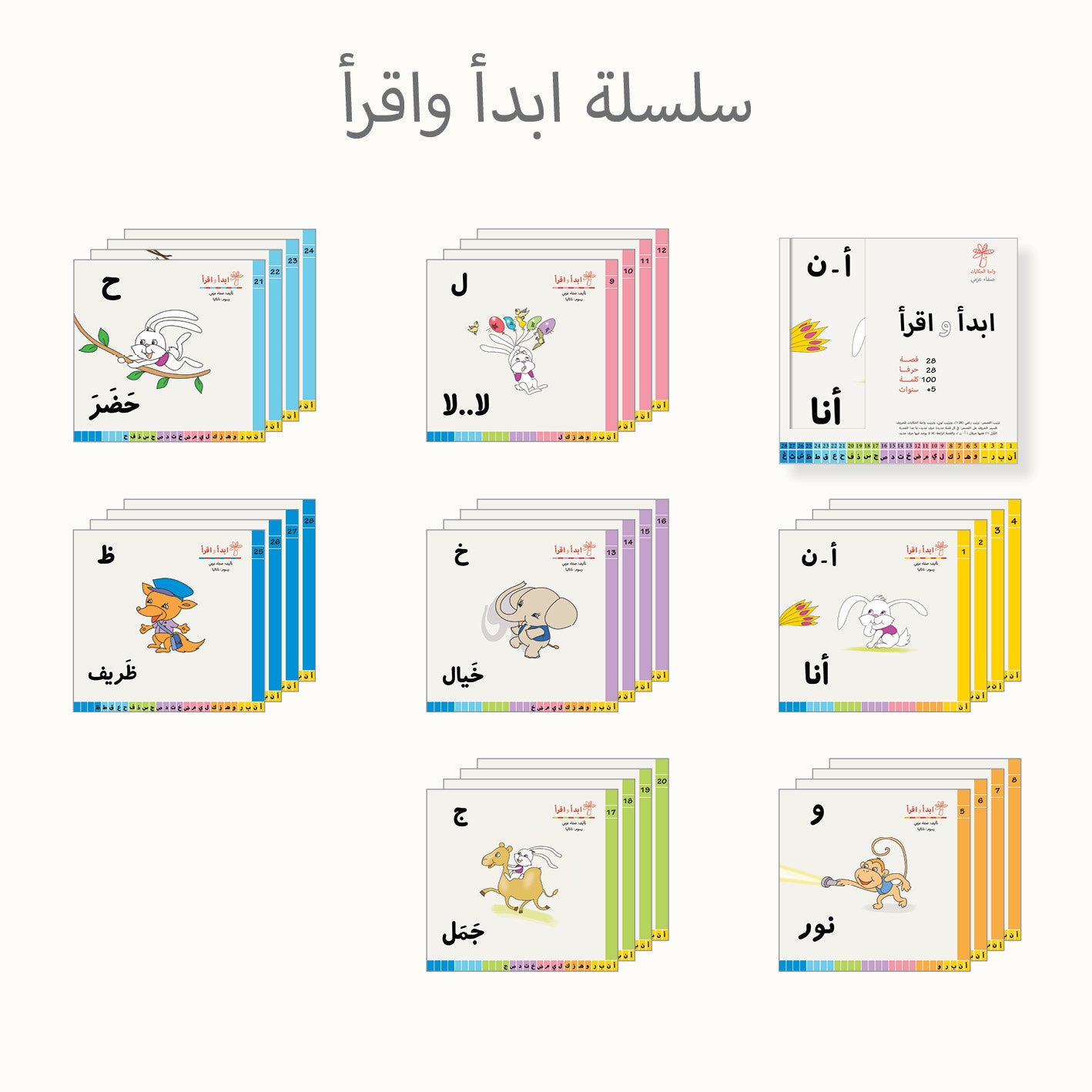 سلسلة ابدأ واقرأ: 28 كتابا، لكل حرف قصة (6-5 سنوات) : مع الأرنب »باني» والزرافة »راني» نقرأ مجموعة من 28 قصة لتعليم القراءة للصغــار الذيـن أكملوا تعلم الحروف وأصبحوا مستعدين لقراءة كلمة وجملة بسيطتين.